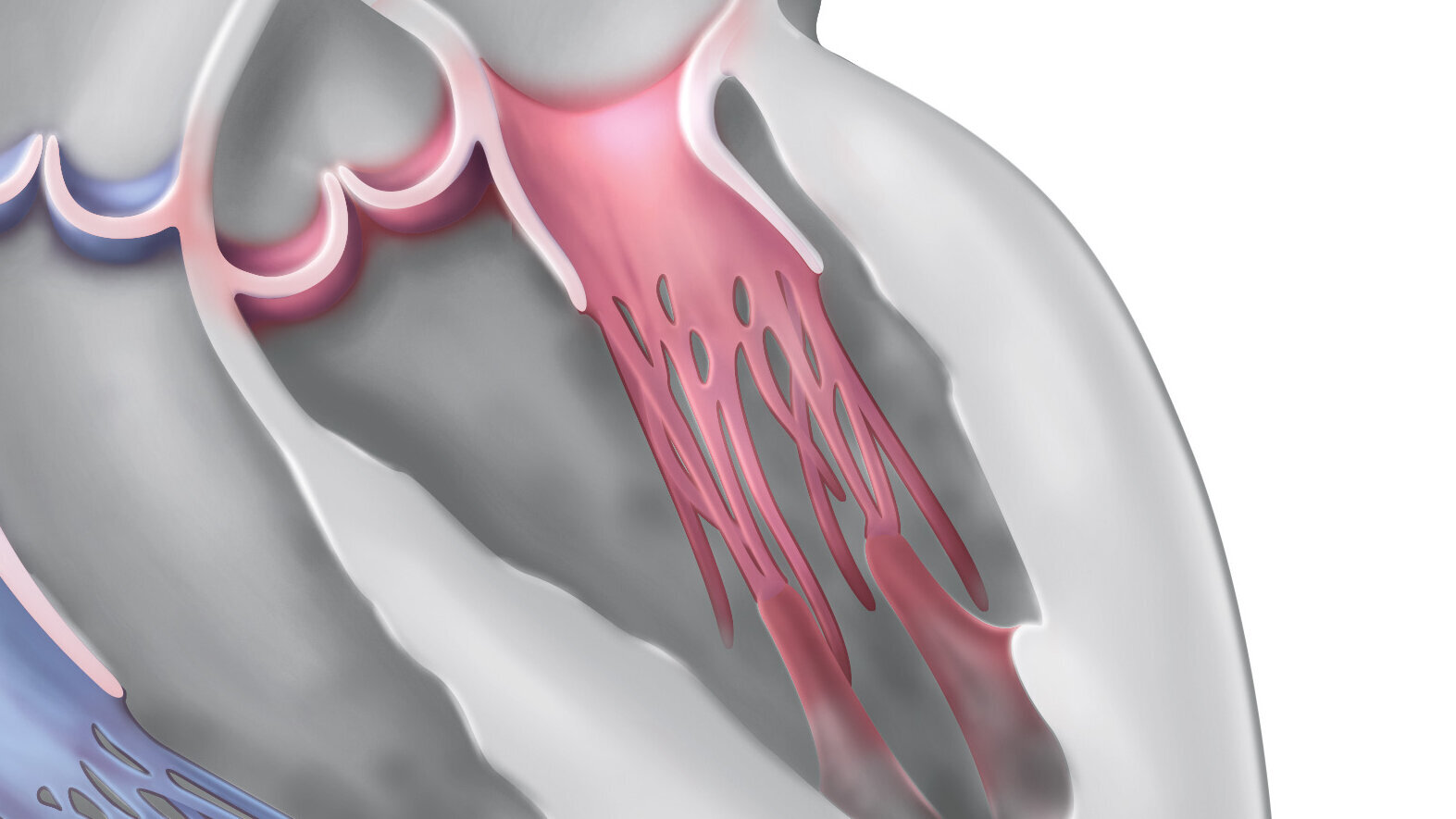 The mitral valve consists of two leaflets, which are anchored in the left ventricle via the so-called chordae tendineae. These chordal cords prevent the leaflets from penetrating into the atrium. Thanks to this structure, the mitral valve allows blood to pass from the left atrium into the left ventricle and then prevents blood from flowing back into the atrium when the ventricle contracts.