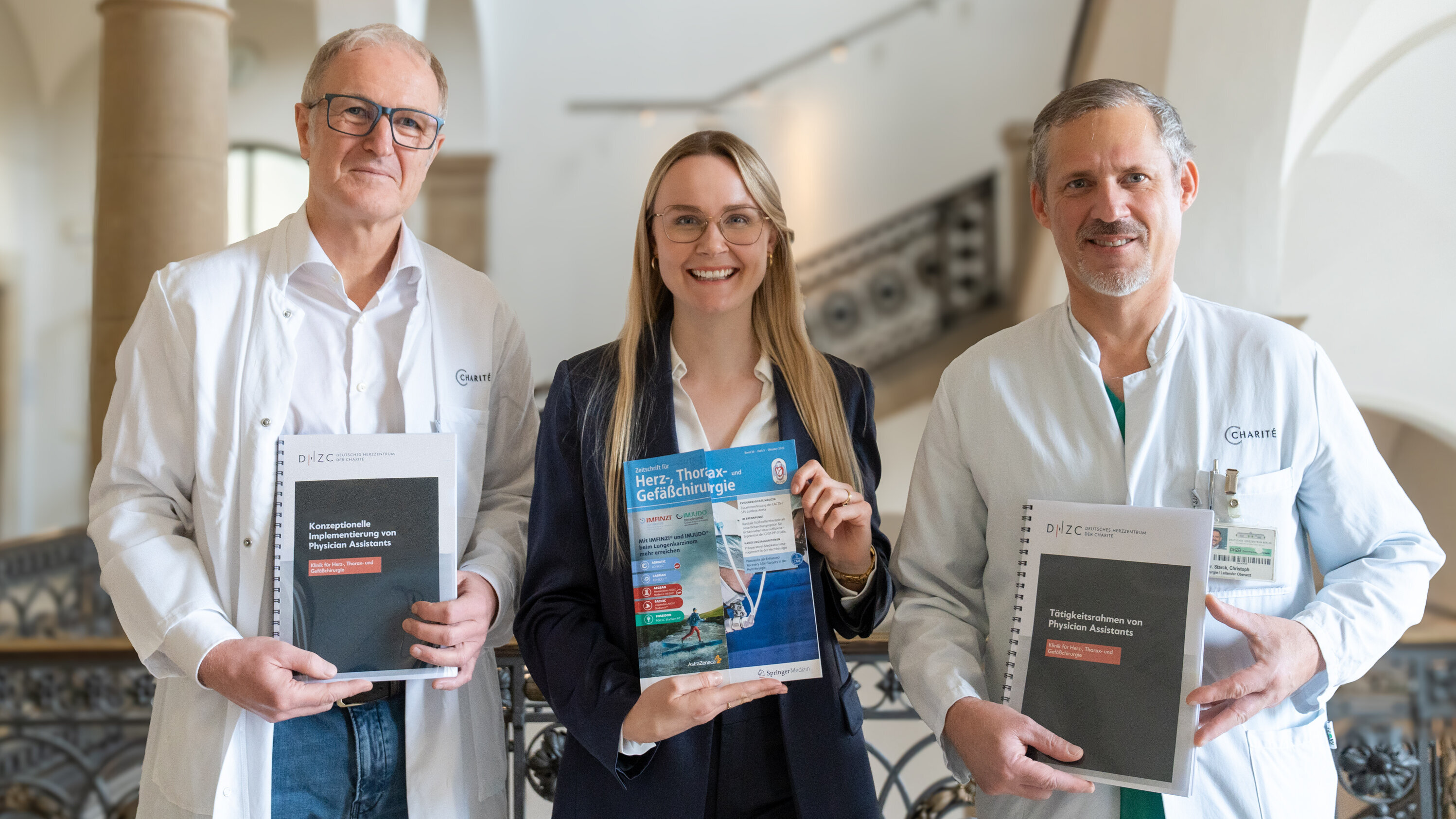 Prof. Volkmar Falk (Ärztlicher Direktor des DHZC), Daria Hunfeld (Leiterin des PA-Teams am DHZC) und Prof. Christoph Starck (Ärztlicher Leiter des PA-Programms am DHZC) mit den neuen Publikationen.