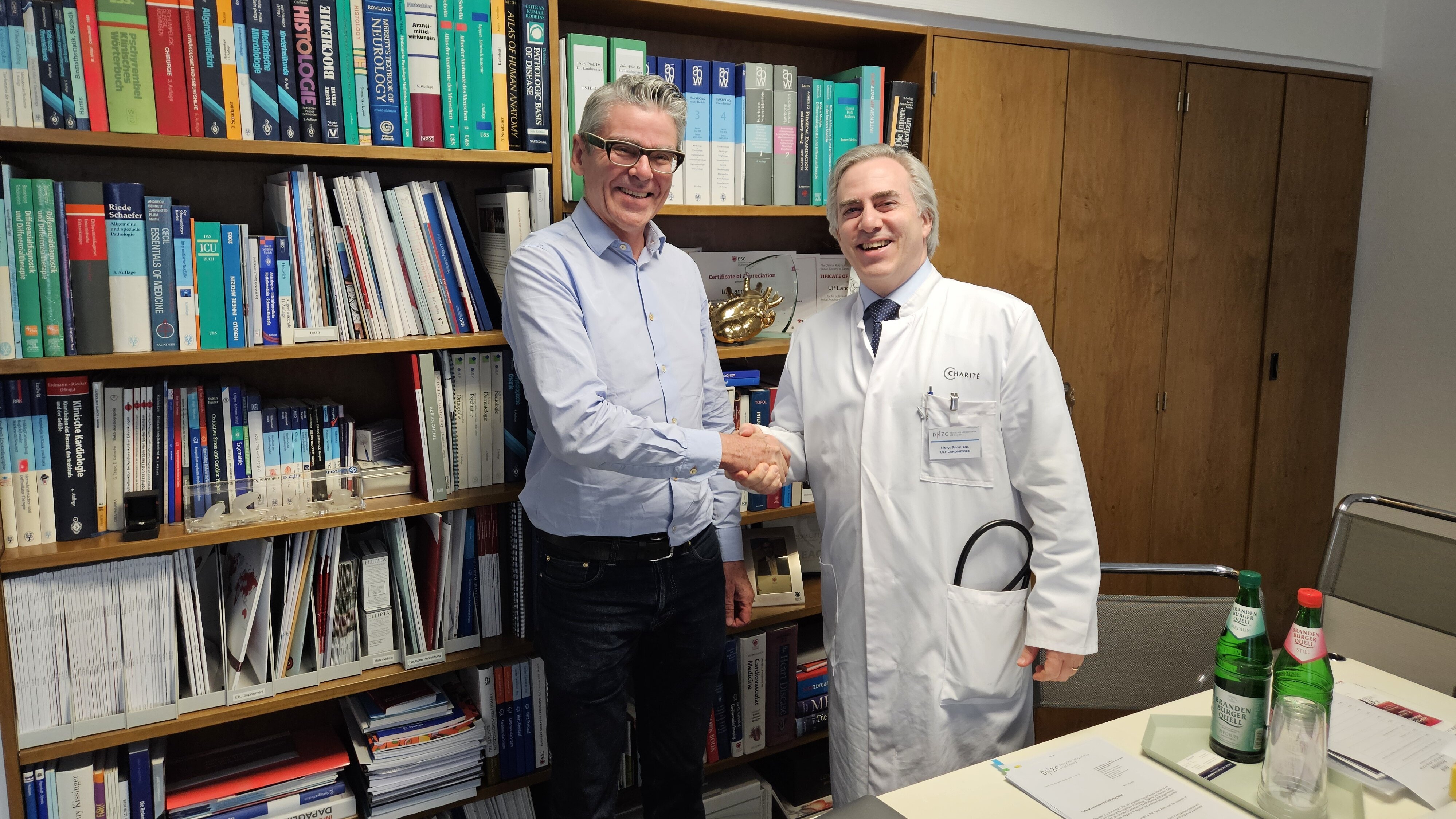 Jetzt hatte er seinen ersten Gastaufenthalt am DHZC und tauschte sich mit Klinikdirektor Prof. Ulf Landmesser über das gemeinsame Forschungsprojekt und die weiteren Schritte aus.