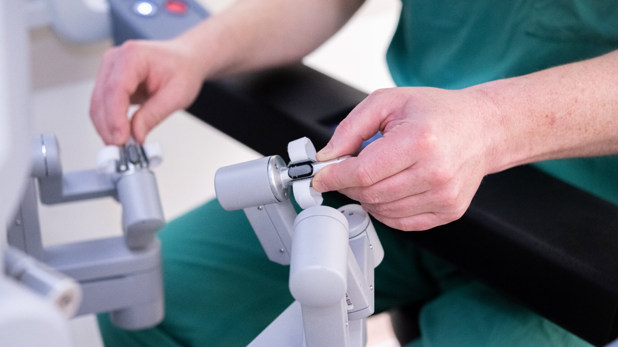 Das System besteht aus vier fein beweglichen Armen, die direkt am Operationstisch positioniert sind. Eine hochauflösende 3D-Kamera überträgt ein vergrößertes Bild aus dem Inneren des Körpers.