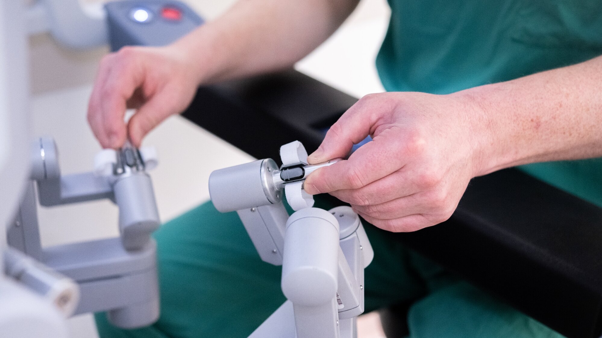 Das System besteht aus vier fein beweglichen Armen, die direkt am Operationstisch positioniert sind. Eine hochauflösende 3D-Kamera – eingeführt über einen der Zugangsports – überträgt ein vergrößertes Bild aus dem Inneren des Körpers.